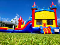 Our Multicolor Bounce house slide features a pool for Water use or a stopper for dry use. Its fully enclosed entrance helps keep small children from falling off from the side of the ramp. Its variety of features make this unit a great addition to any party!
