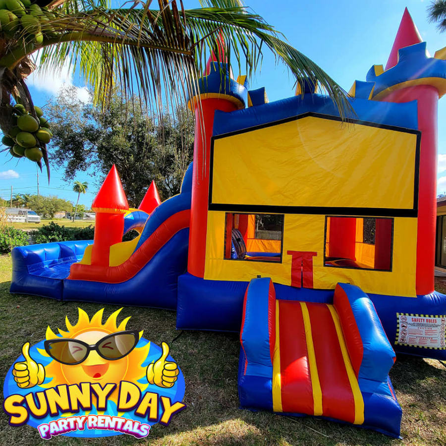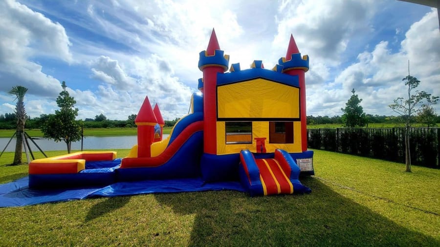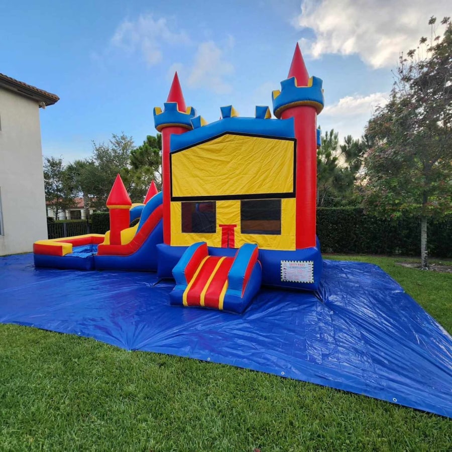 Our Multicolor Bounce house slide features a pool for Water use or a stopper for dry use. Its fully enclosed entrance helps keep small children from falling off from the side of the ramp. Its variety of features make this unit a great addition to any party!