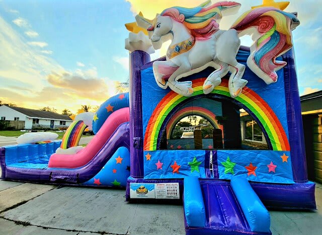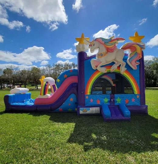 Our Unicorn combo is a Magical rental! With bounce house, 2 obstacle Pillar, basketball hoop and pool, it can be used wet or dry. Rent this combo Today to Bring the Fun and the Magic to your Event.